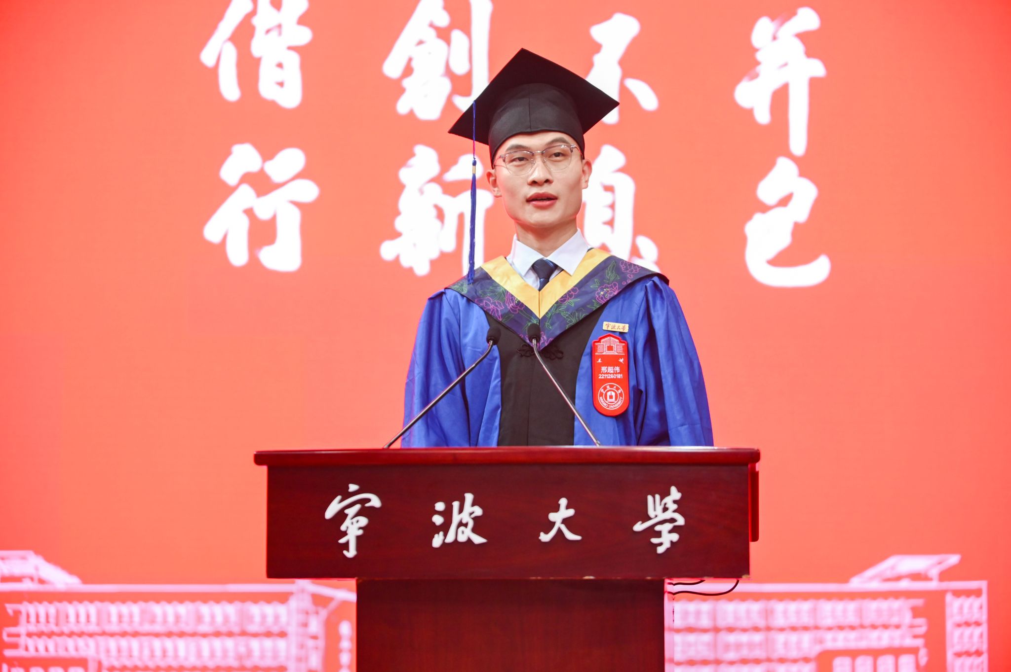 毕业生代表、材料科学与化学工程学院材料与化工专业硕士研究生邢超伟分享自己如何在宁大实现学术成长,收获花样“研”华,进而传导宁大温度的核心“配方”。他代表毕业生庄严承诺:未来无论深耕科研或扎根基层,都将栉风沐雨不改从容,披荆斩棘乘风破浪。